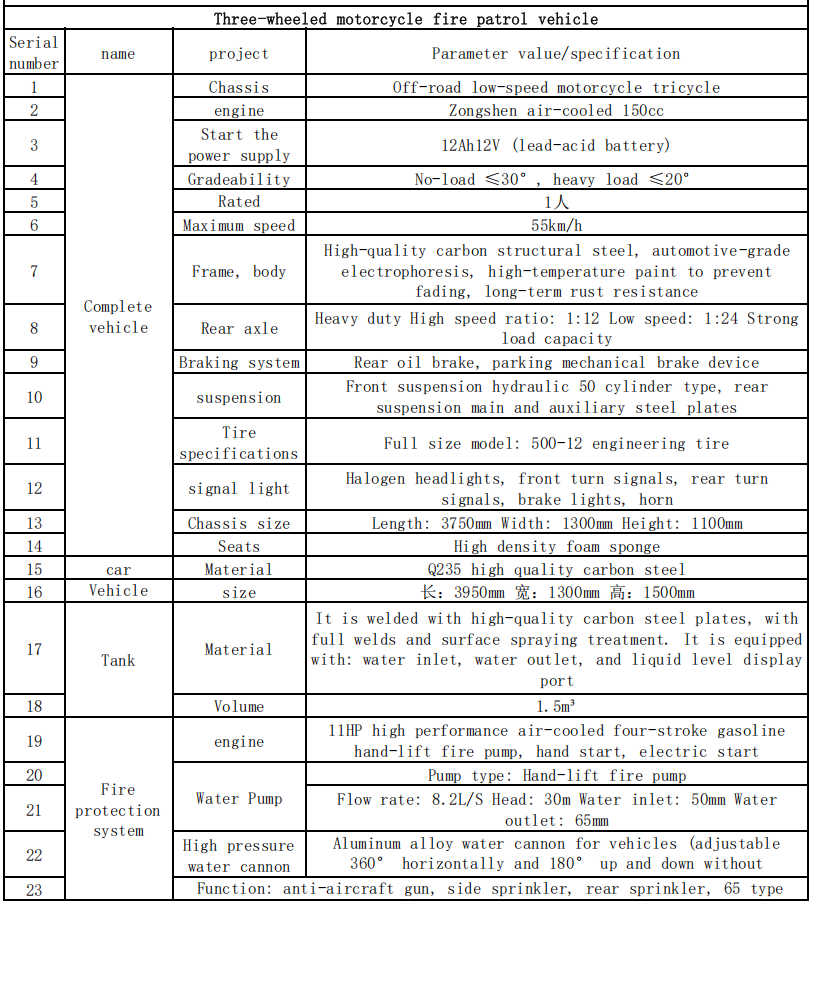 시골 도로의 등급이 낮고 소방서와의 거리가 멀기 때문에 삼륜 소방 오토바이는 향 전문 소방대의 주요 장비로 사용할 수 있습니다. 이륜차보다 더 많은 물자를 운반할 수 있고, 사륜 소방차보다 복잡한 도로 상황에 더 잘 적응해 '인근 경찰 출동과 신속한 처리'를 실현한다.